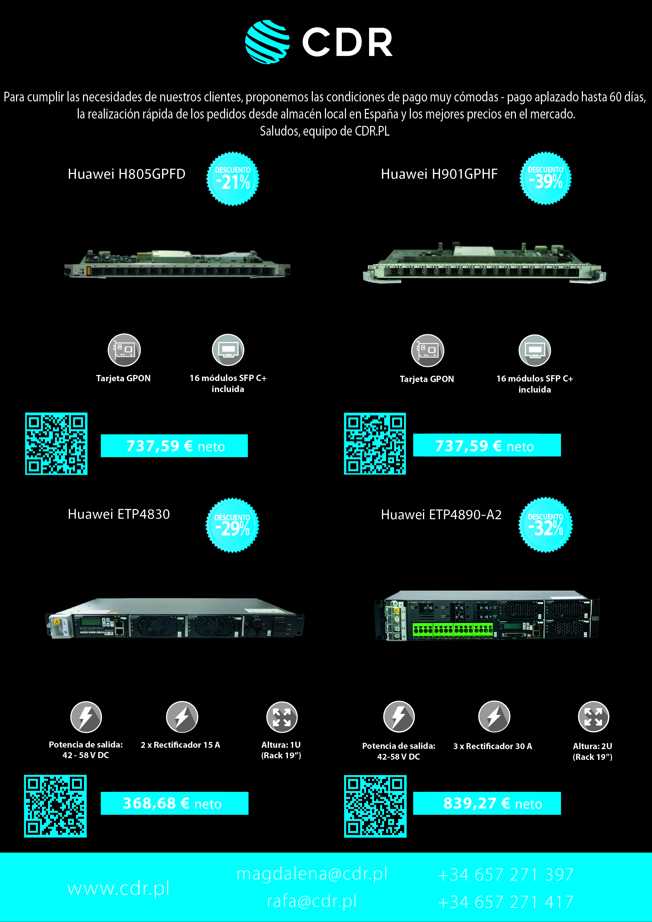 También recordamos de la alimentación de los terminales de transmisión (OLT). Los sistemas de alimentación ininterrumpida ETP4830 y ETP4890 tienen una salida de 48 V adaptada a las OLT GPON de Huawei. ¡Además, puedes conectar las baterías y garantizar una fuente de alimentación de emergencia!