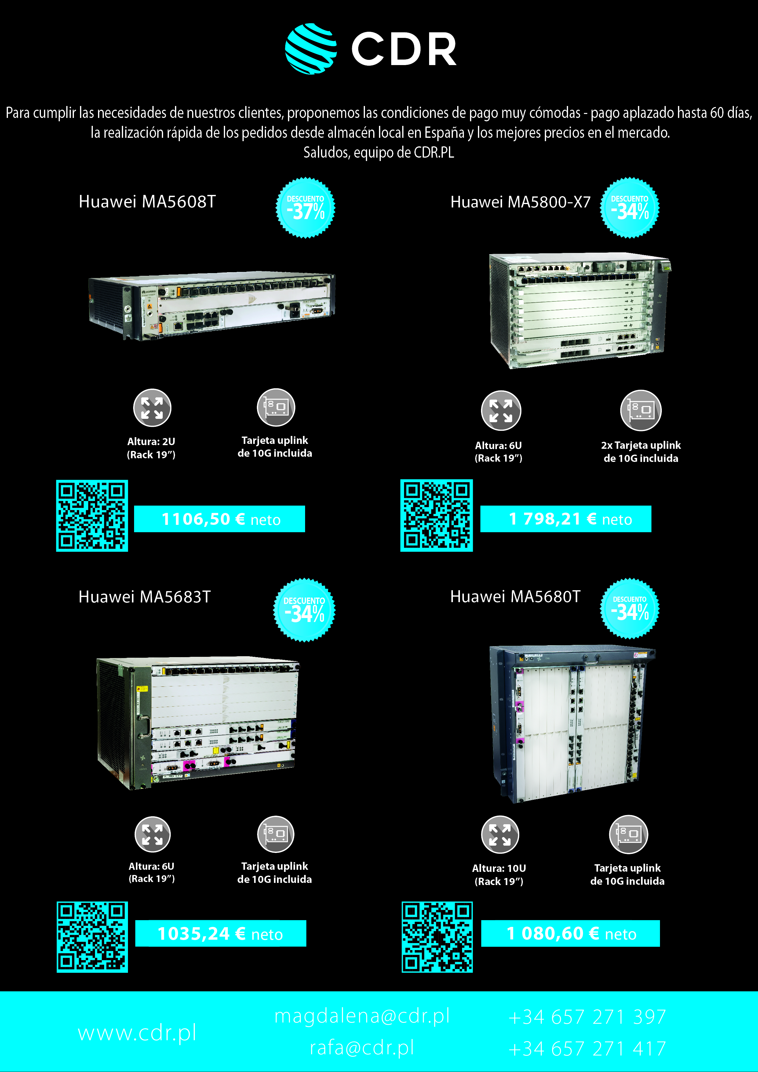 También ofrecemos el terminal MA5800-X7 a un precio promocional. Esta es una nueva serie de OLT compatible con el próximo estándar XGPON, gracias al cual en el futuro podrás ofrecer a tus